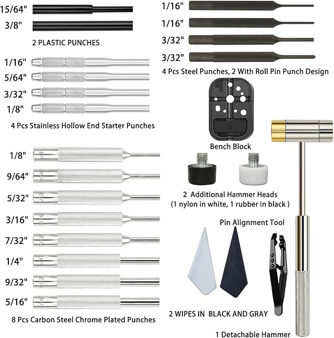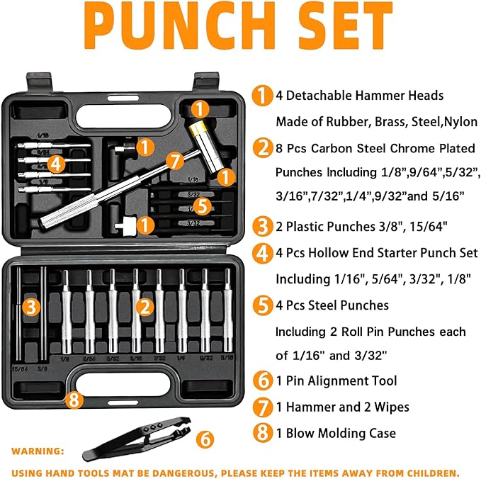 - 8 Precision Pin Punches: 1/8", 9/64", 5/32", 3/16", 7/32", 1/4", 9/32", 5/16"